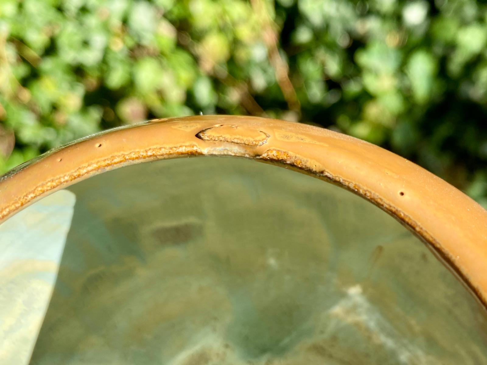 Dit handgemaakte bolvaasje heeft een warme honingkleur met sierlijke lopers die langs de ronding naar beneden vloeien. Er zit een kleine imperfectie aan de rand, waardoor dit vaasje een plekje in de koopjeshoek heeft gekregen maar zijn charme en bruikbaarheid blijven intact.