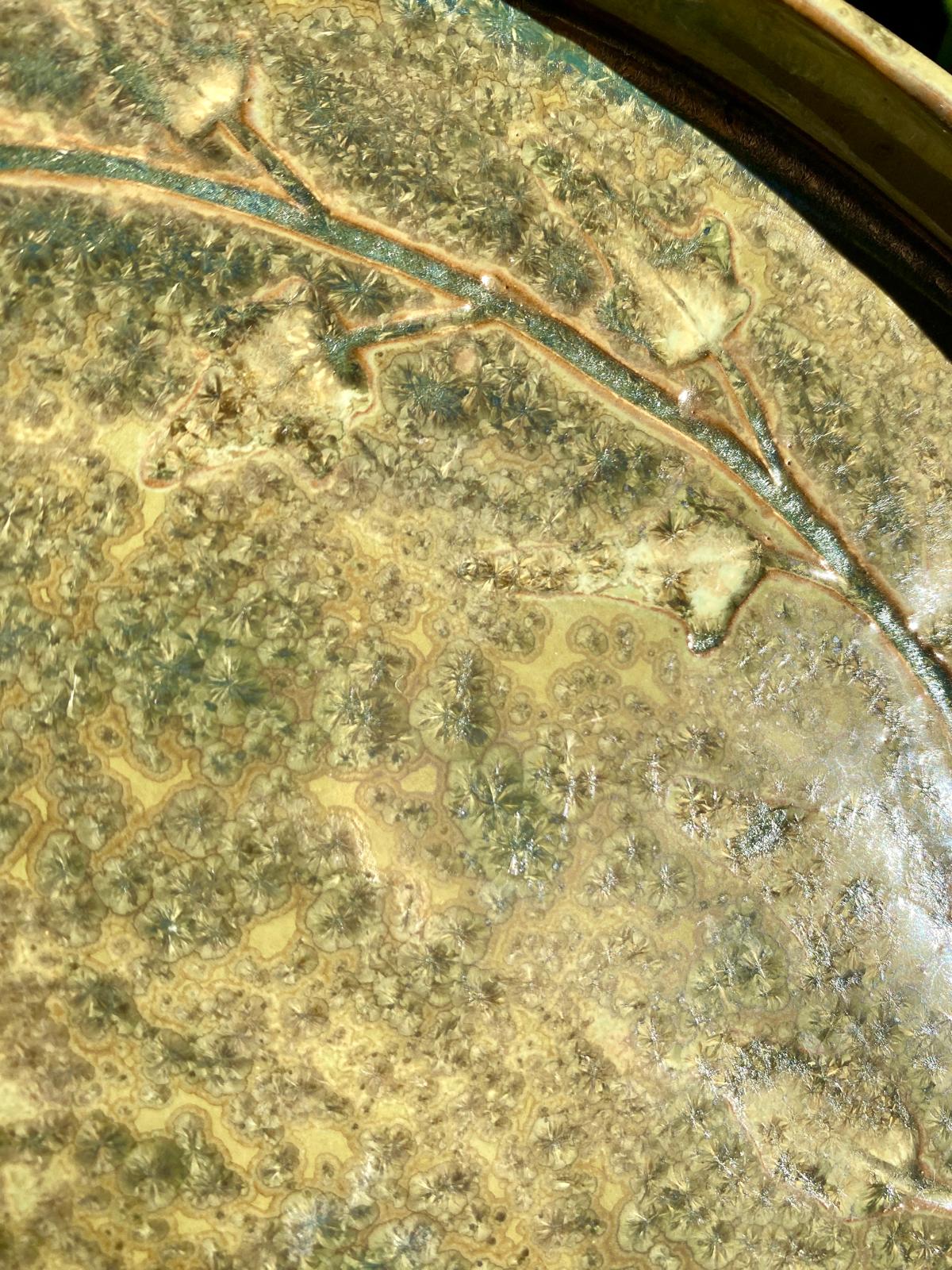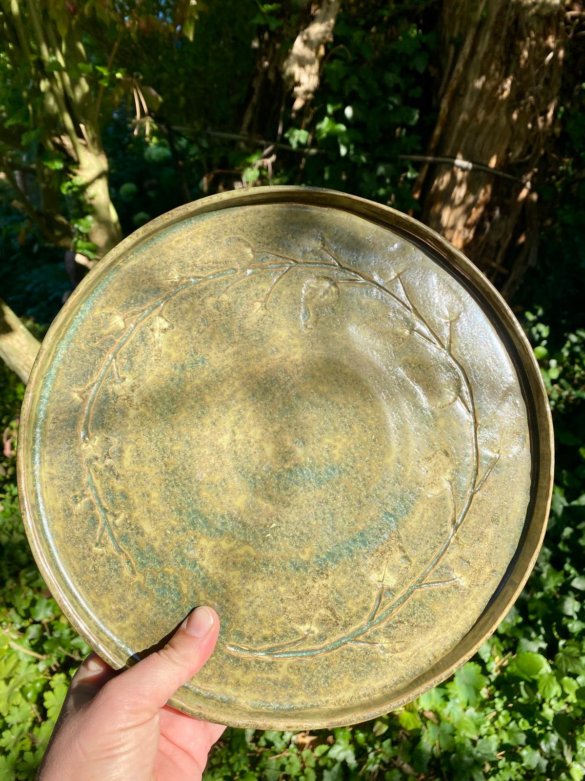 Dit handgemaakte keramieken bord of kaarsenplateau is afgewerkt met een sprankelend groen kristalglazuur. In het oppervlak is subtiel de afdruk van een klimopblad verwerkt, wat het geheel een tijdloos en natuurlijk karakter geeft.