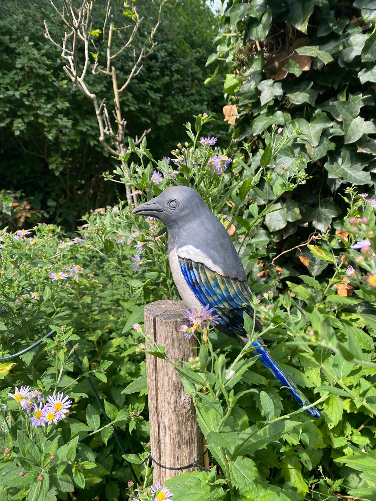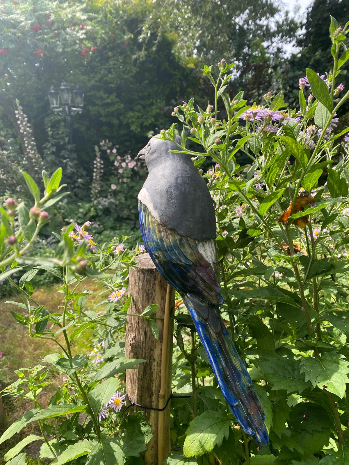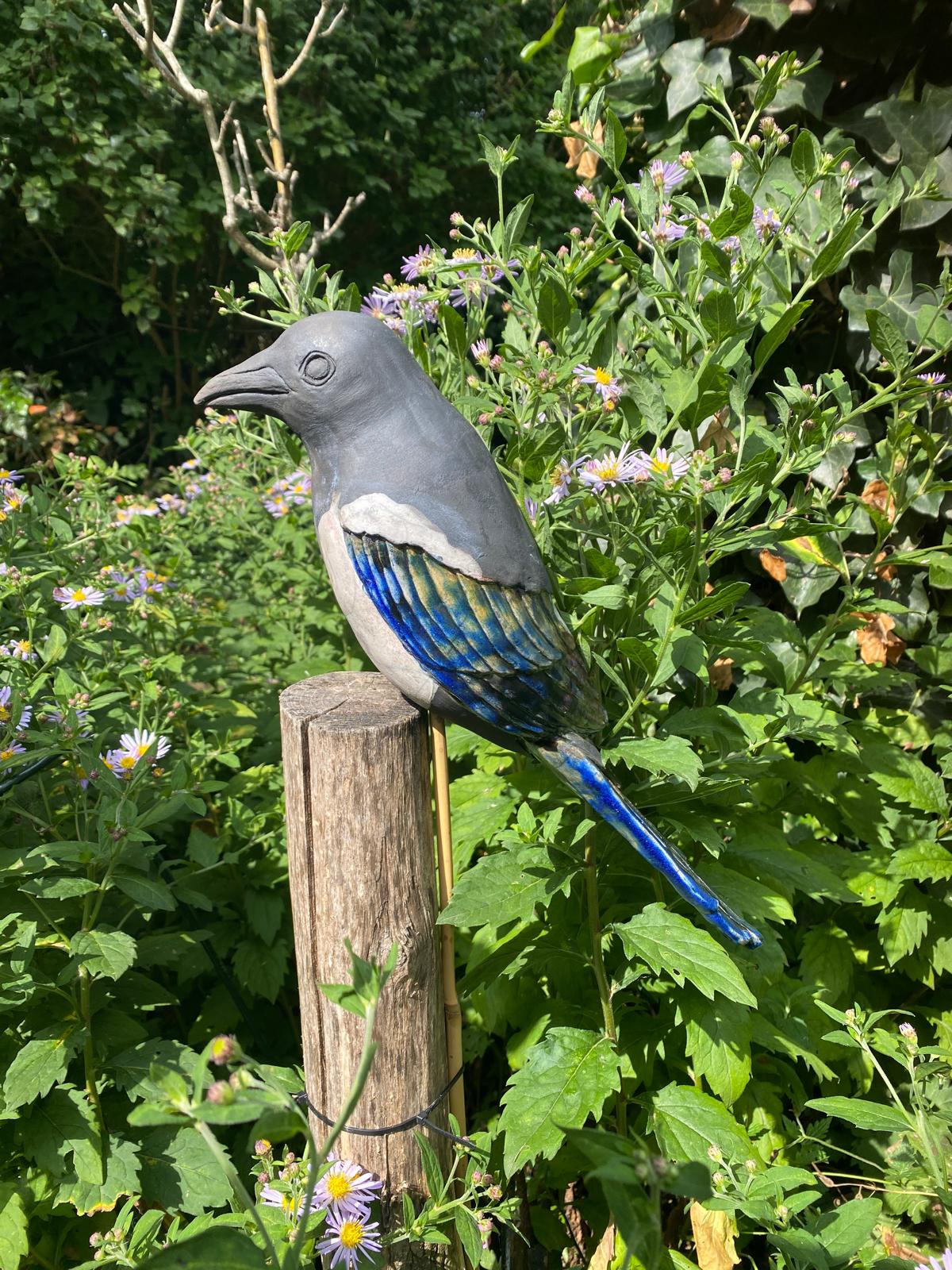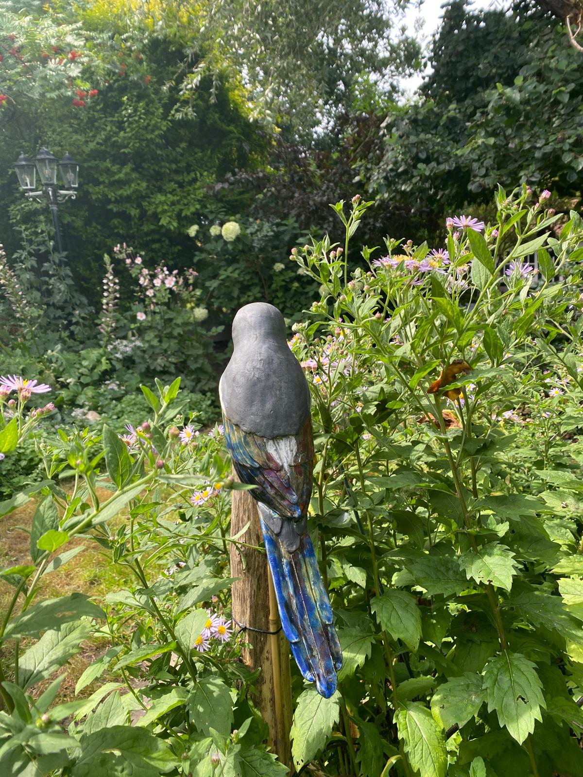 Dit handgemaakte keramieken tuinbeeld van een Ekster is een krachtig en speels kunstwerk. Door de raku-stooktechniek en de verschillende gebruikte glazuren krijgt het beeld een uniek, levendig mat en olie-patroon.