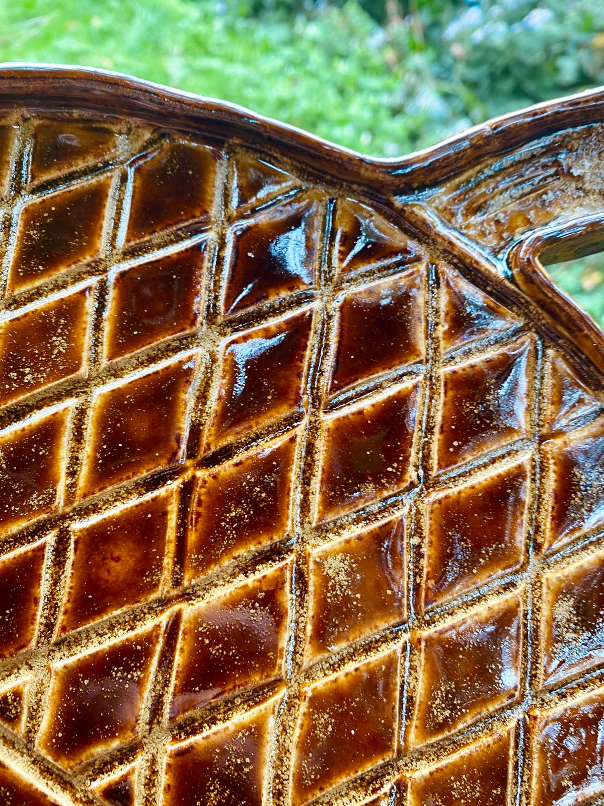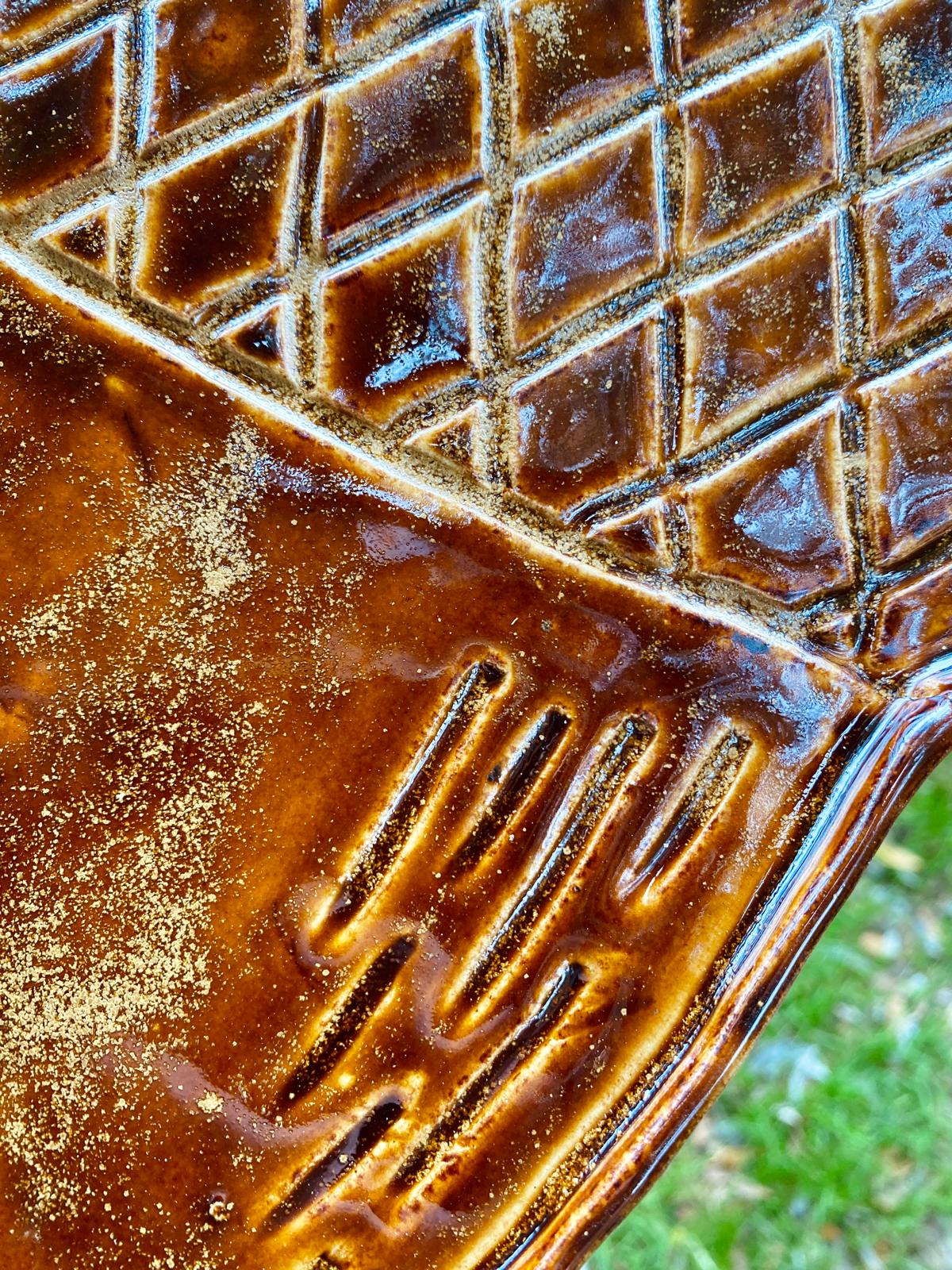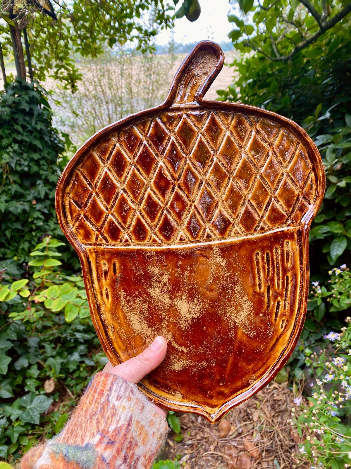 Dit grote keramieken bord in de vorm van een eikel is geglazuurd in warme honing- en bruintinten. Er zitten enkele kleine imperfecties in maar zijn charme en bruikbaarheid blijven volop aanwezig.