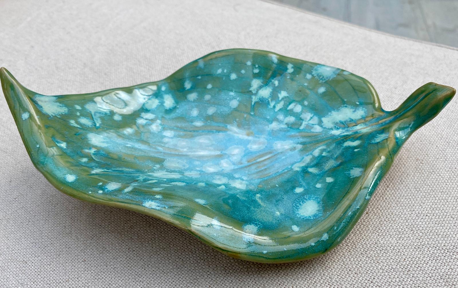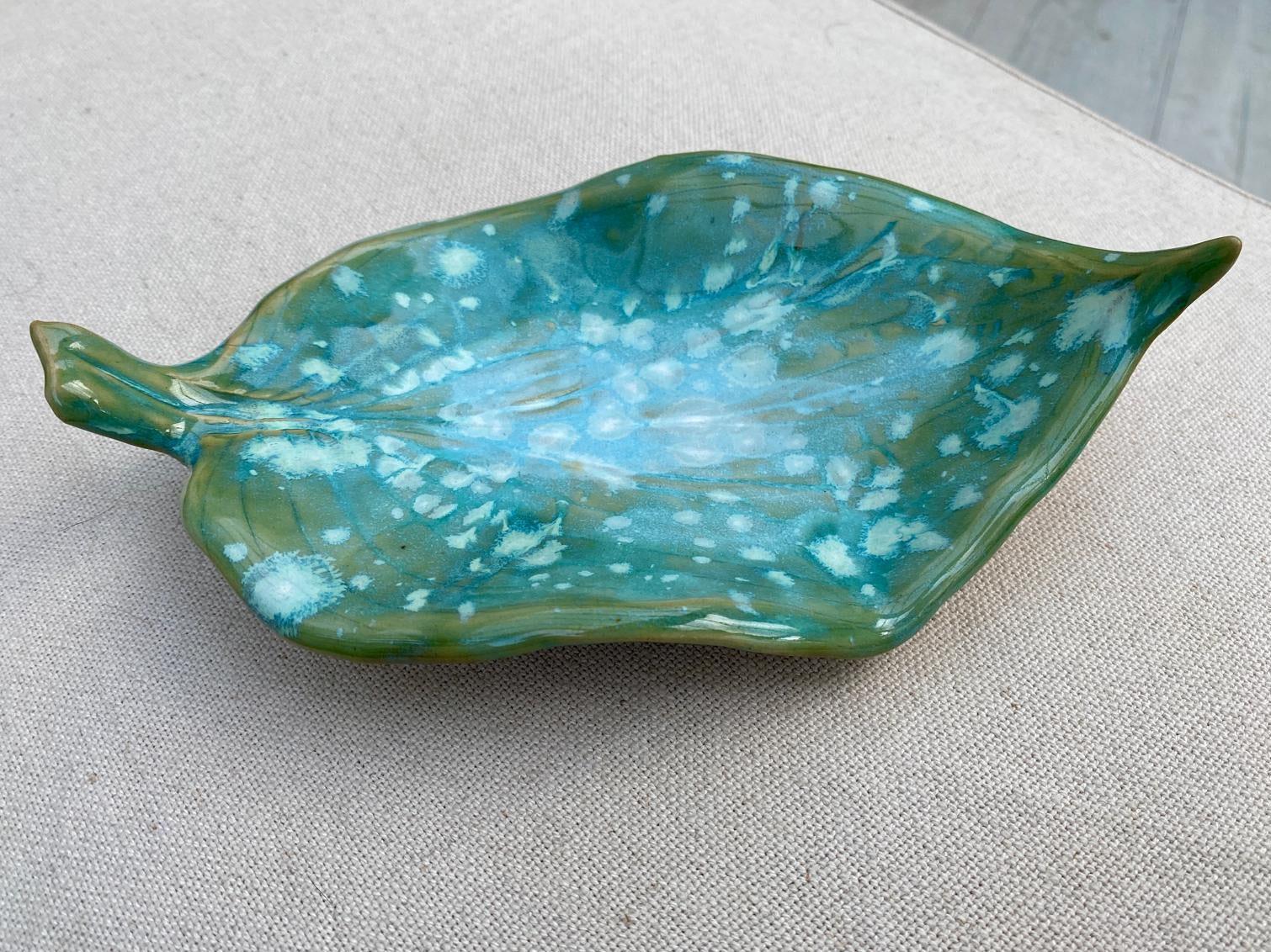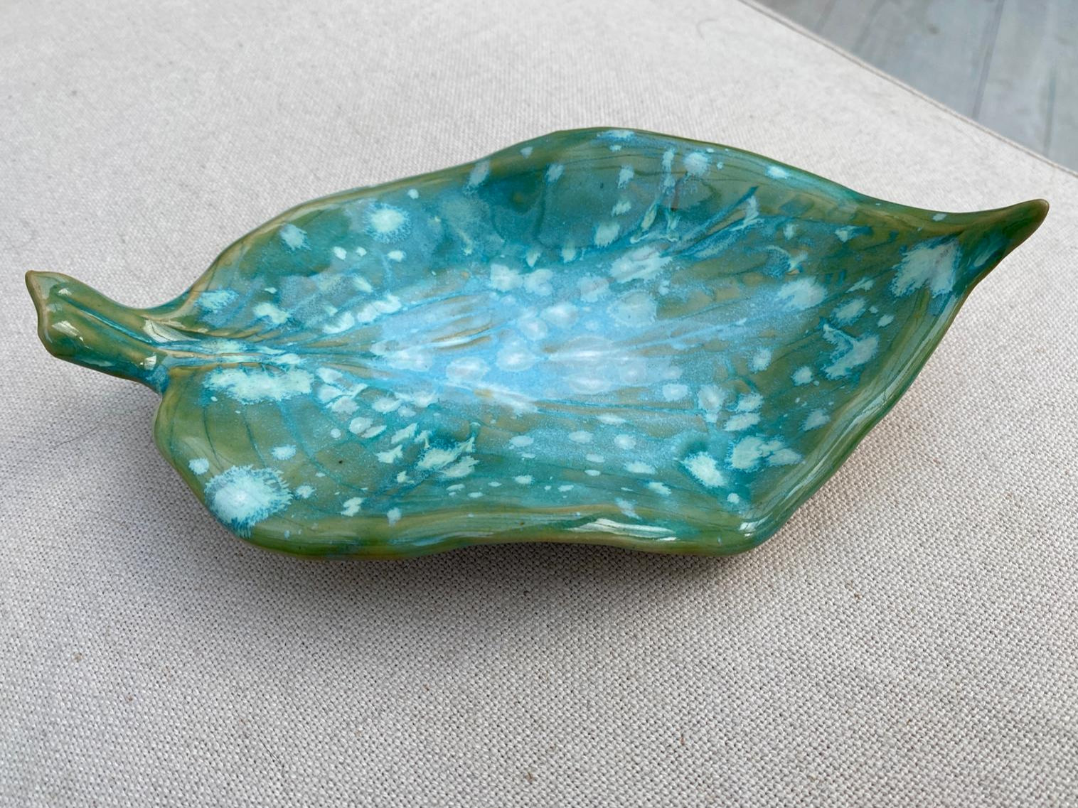 Dit handgemaakte schaaltje in hostablad is geglazuurd in fris mintgroen met speelse witte spikkels. Licht en luchtig van uitstraling, ideaal voor een, zeepje of gewoon als vrolijk decoratief detail.