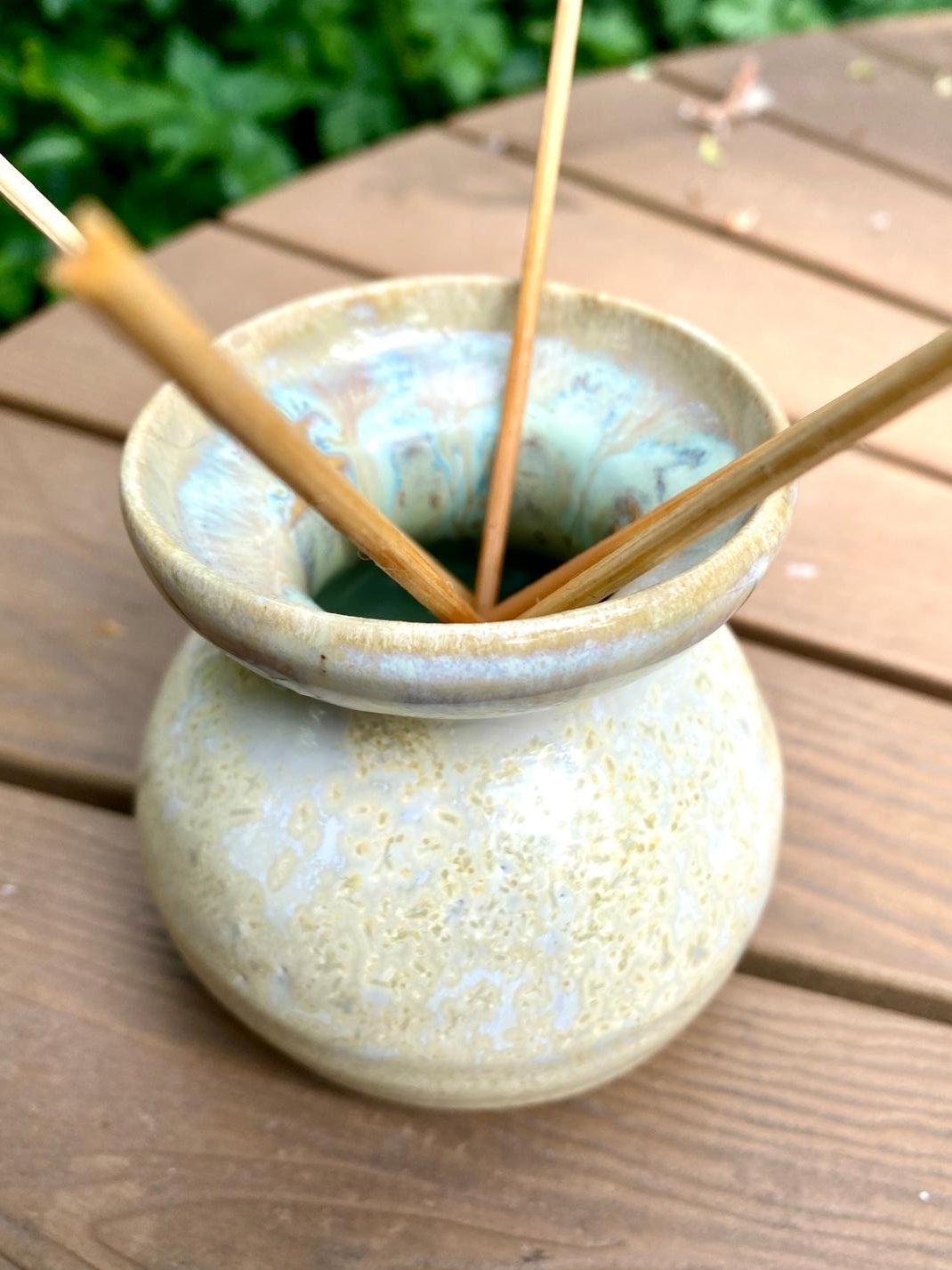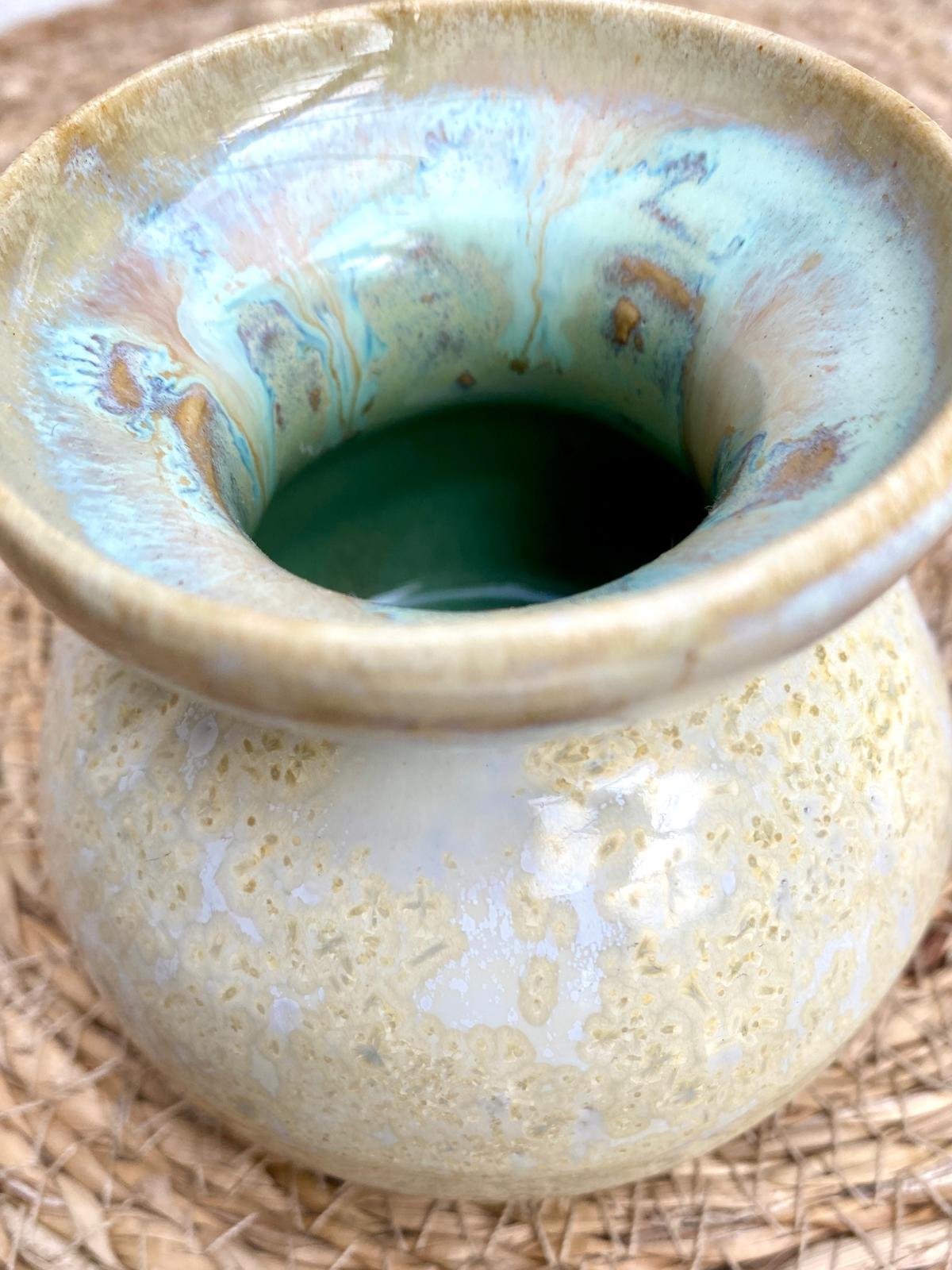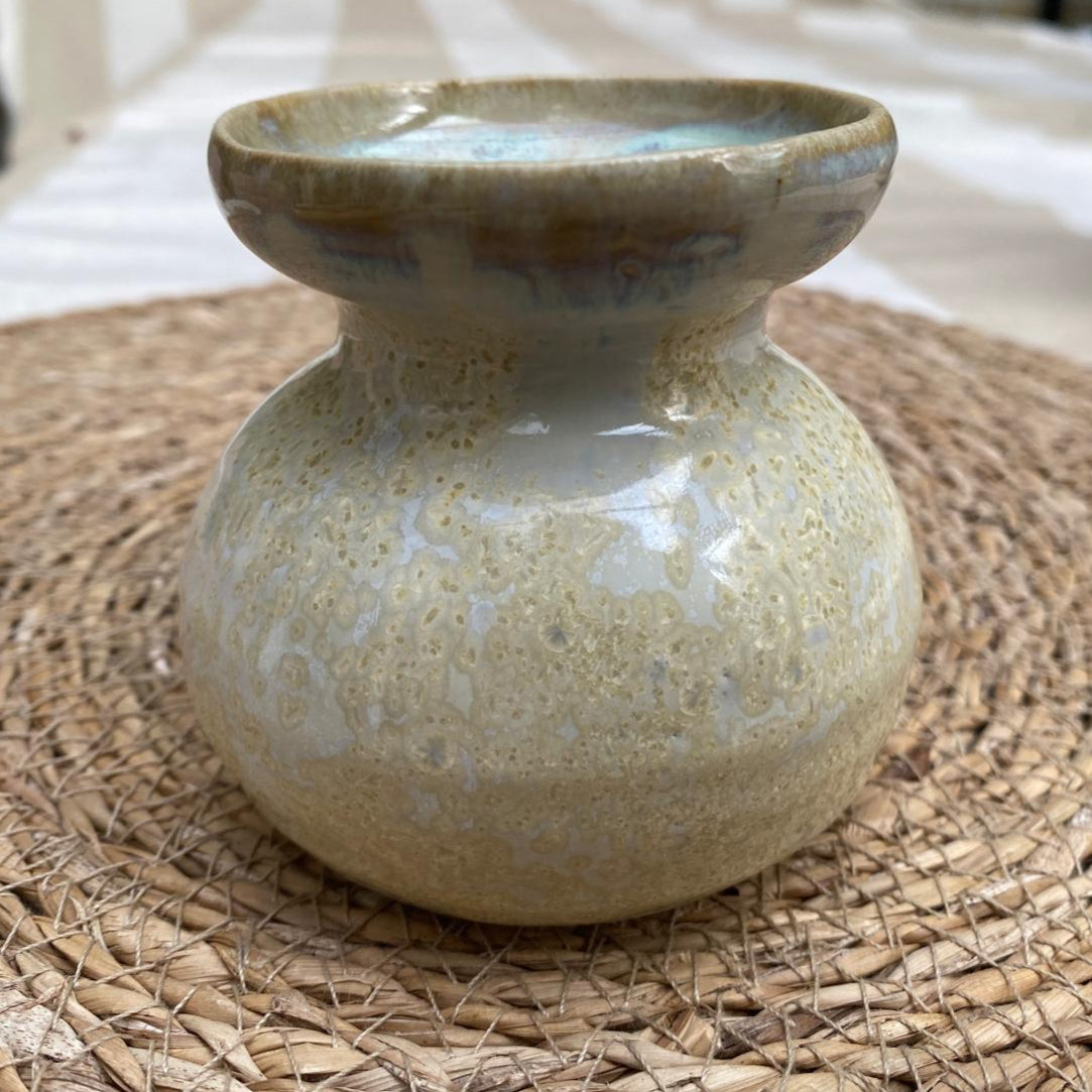Dit handgemaakte keramieken minivaasje heeft een bijzonder wit/crème kristalglazuur met aan de binnenkant een zachte groene tint. Perfect als klein vaasje voor een enkele Narcisbol, maar ook ideaal voor geurstokjes of als subtiel decoratief accent.