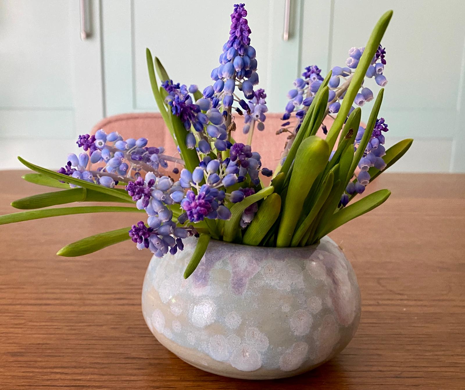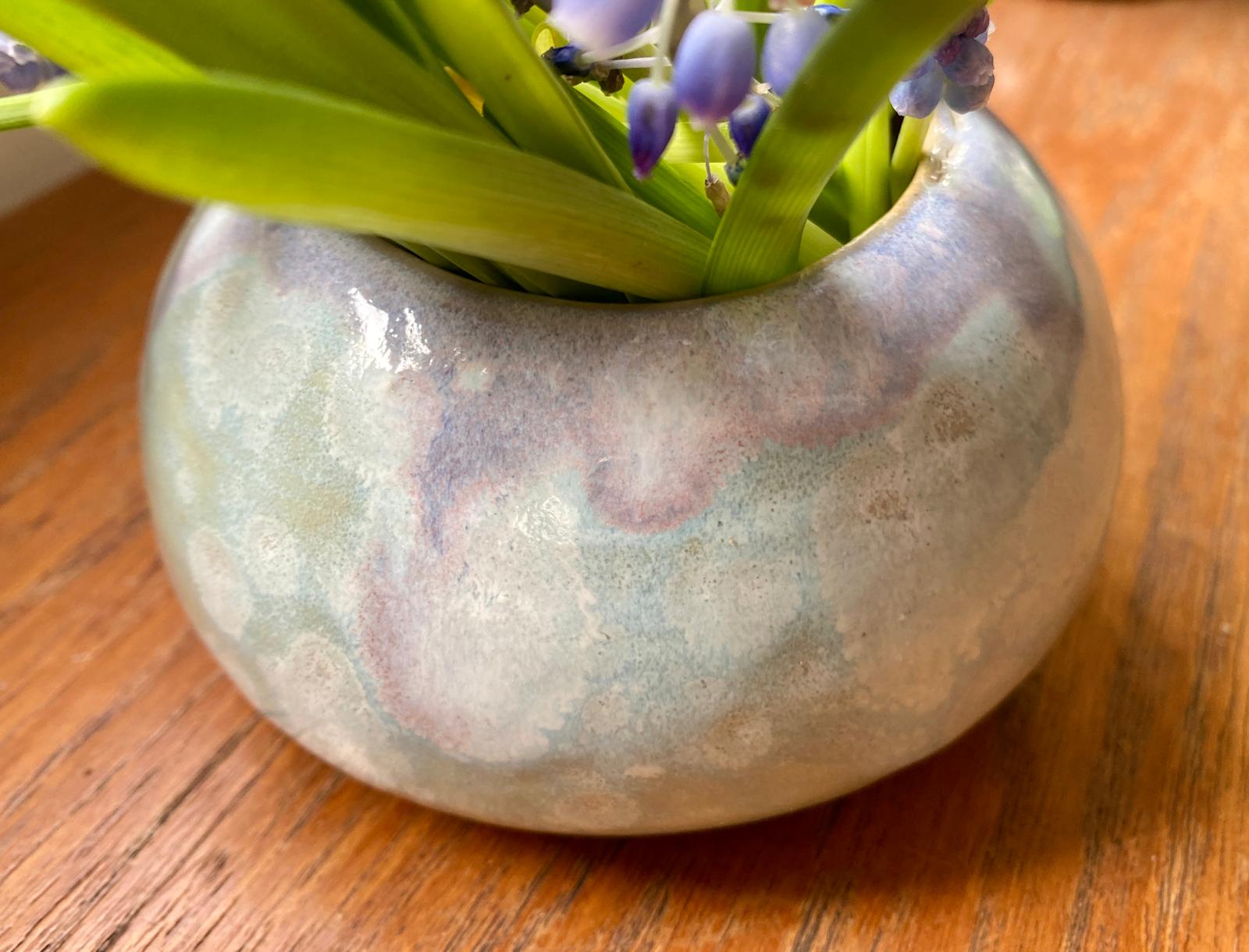 Dit handgemaakte keramieken vaasje is afgewerkt met een lichtblauw en lila spikkelglazuur dat zachtjes in elkaar overvloeit. Perfect voor een enkele bloem, een bloembol of als houder voor geurstokjes.