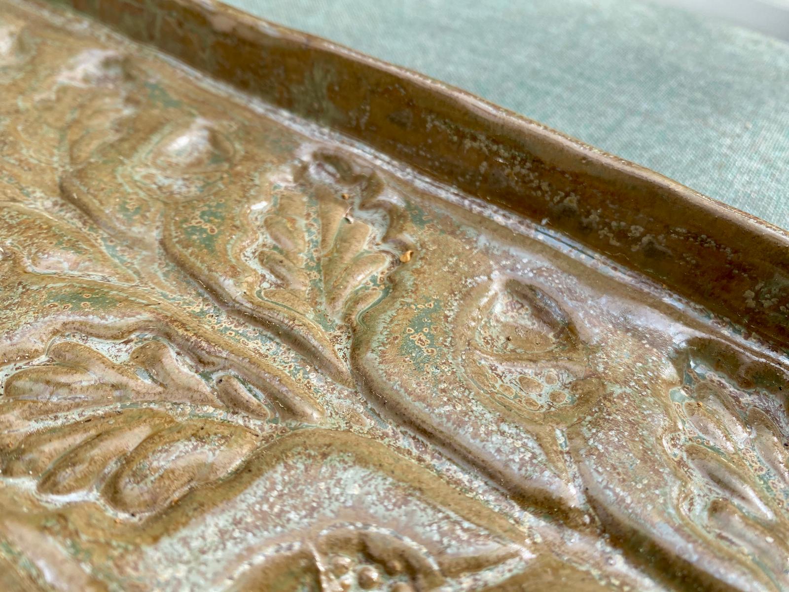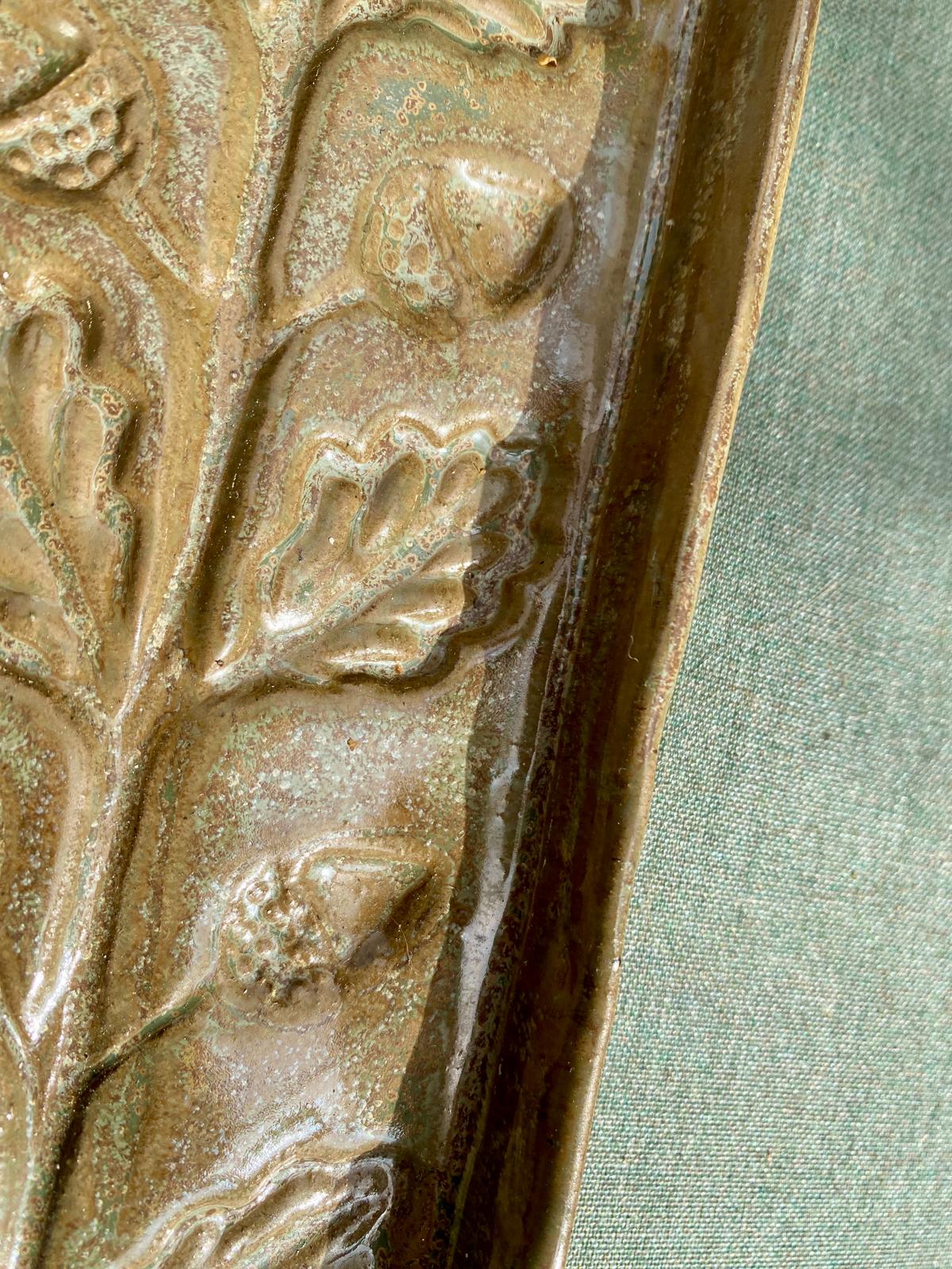 Deze handgemaakte keramieken schaal is afgewerkt met een warm bruin glazuur en subtiele groene accenten. Het klassieke eikenbladpatroon geeft de schaal een tijdloze uitstraling, perfect als fruitschaal, stokbroodje, voor andere lekkernijen of gewoon als decoratief stuk.