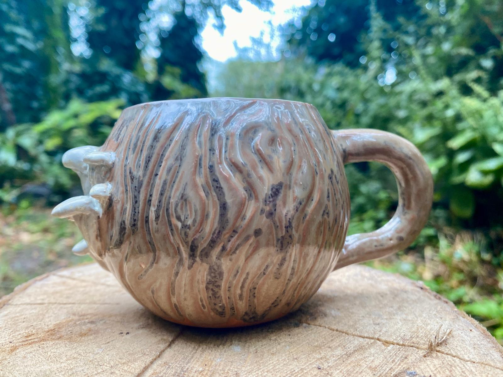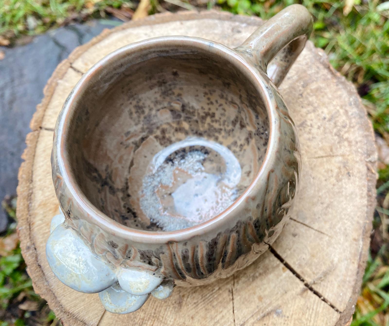 Dit handgemaakte mokje is versierd met fijne paddenstoeltjes en afgewerkt met een bijzonder kristalglazuur. Het resultaat is een betoverend samenspel van kleuren en patronen dat elke mok uniek maakt. Perfect om je thee, koffie of warme chocolademelk in te drinken en minstens zo leuk om neer te zetten als klein kunstwerkje.