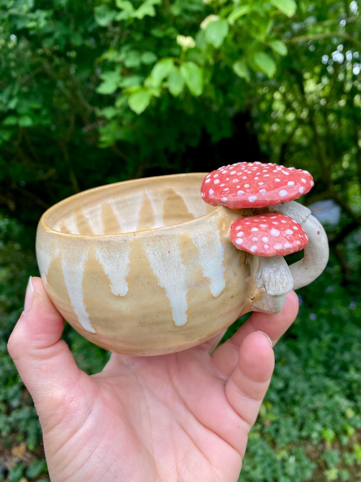 Deze handgemaakte mok is geglazuurd in een zachte gele tint en versierd met twee vrolijke vliegenzwammen. Een speels en sfeervol ontwerp dat elke koffiepauze verandert in een klein herfstfeestje.