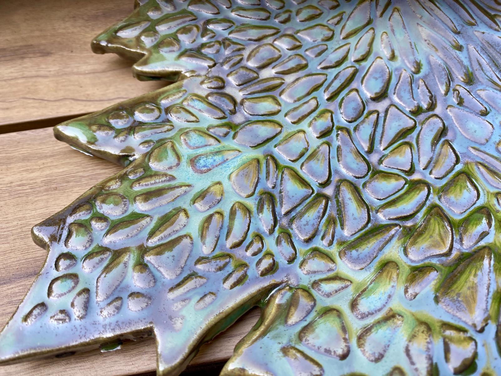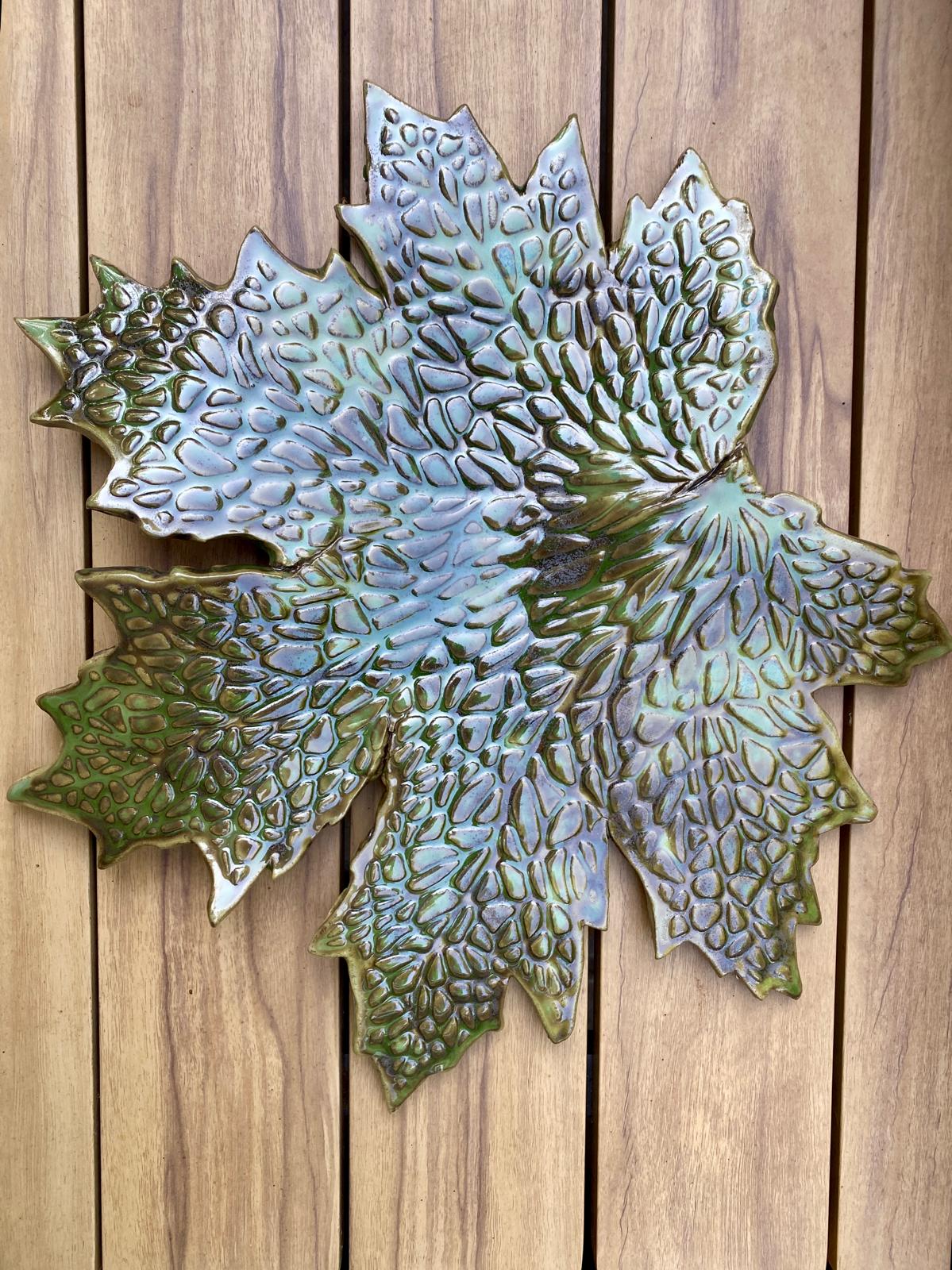 Een grote schaal, welke zowel scheuren al een doorgezakt pootje heeft opgelopen. Het glazuur daarin tegen is prachtig gelukt. Wil je een mooi decoratiestuk voor in de tuin of zien je iets voor aan de wand dan is deze perfect voor jou.