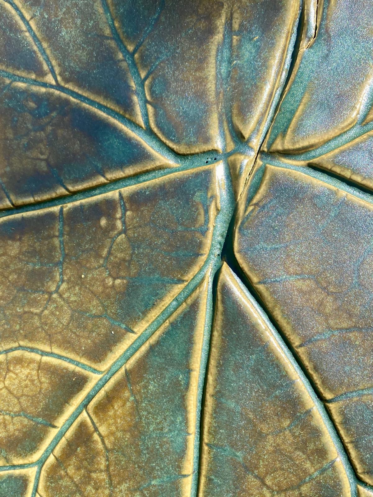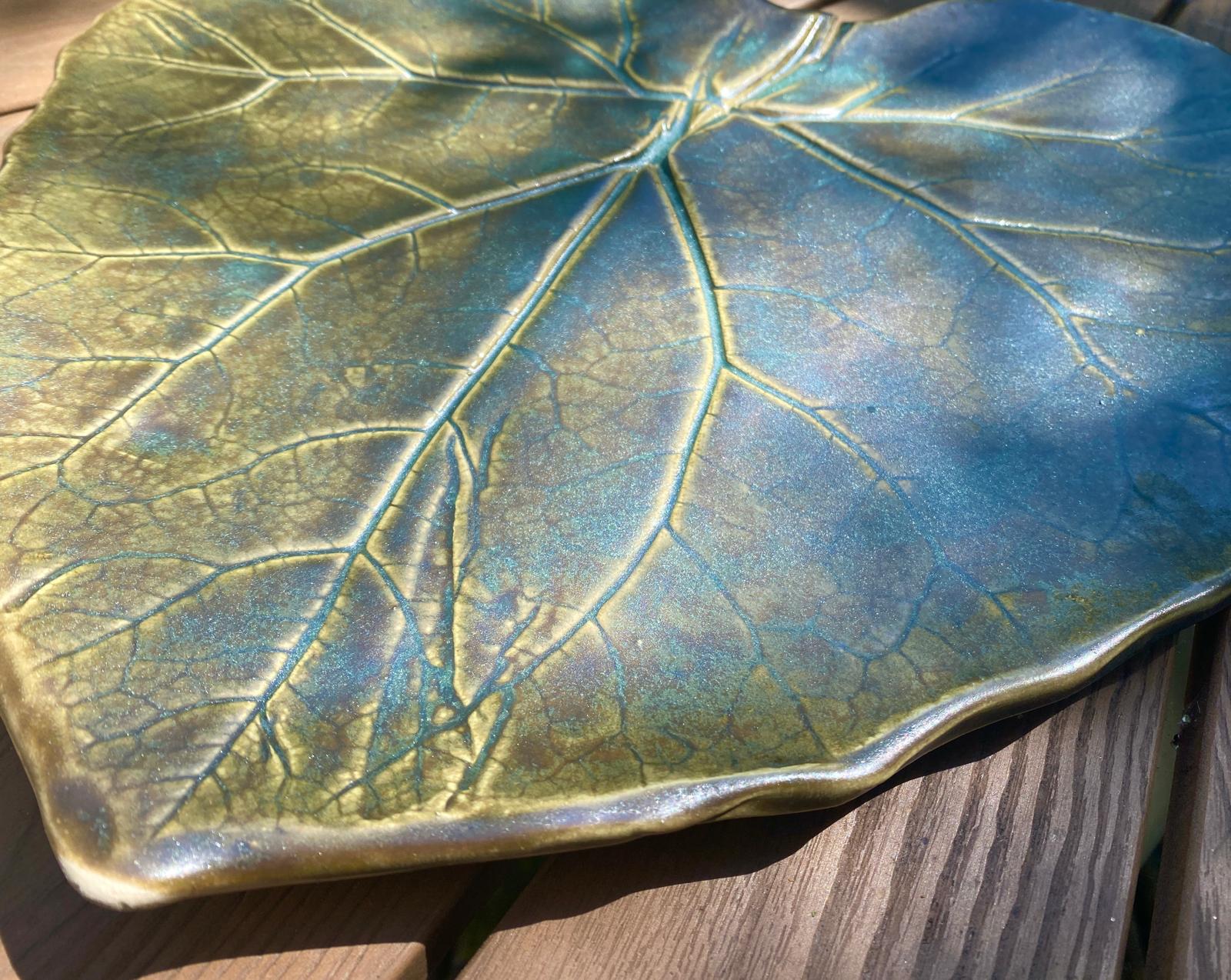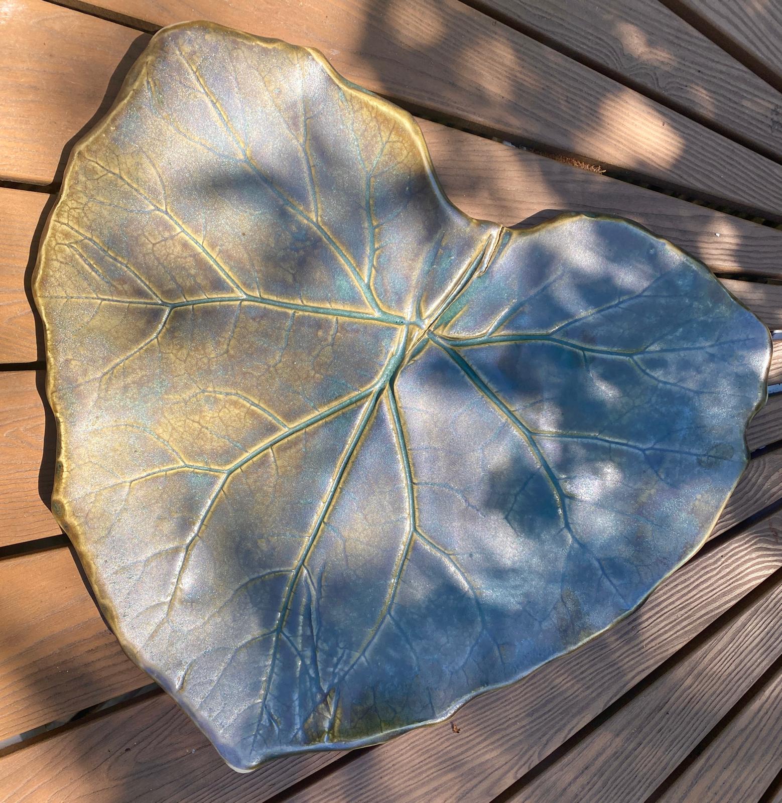 Deze schaal is gemaakt met behulp van het Groot hoefblad uit de tuin. Het Groot hoefblad groei zo hard dat ik er af en toe bladeren van afknip om schalen, borden en kommen van te maken. De schaal is ongeveer 35 cm groot en afgewerkt met een uniek mat kristalglazuur. De Kristallen geven een glitter effect in de zon.