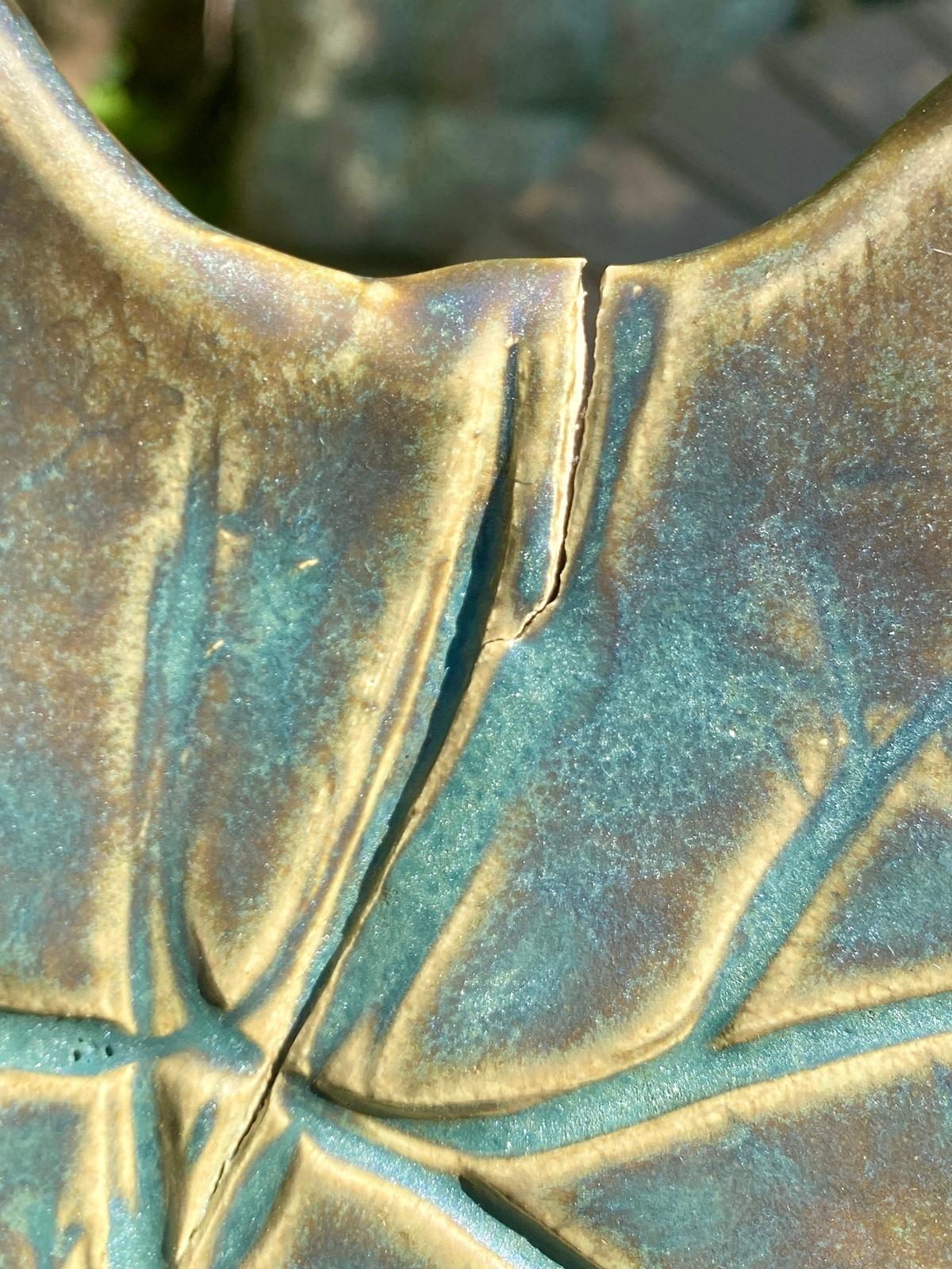 Let op: er zit een kleine scheur in de schaal ontstaan tijdens het bakken, zie foto.
