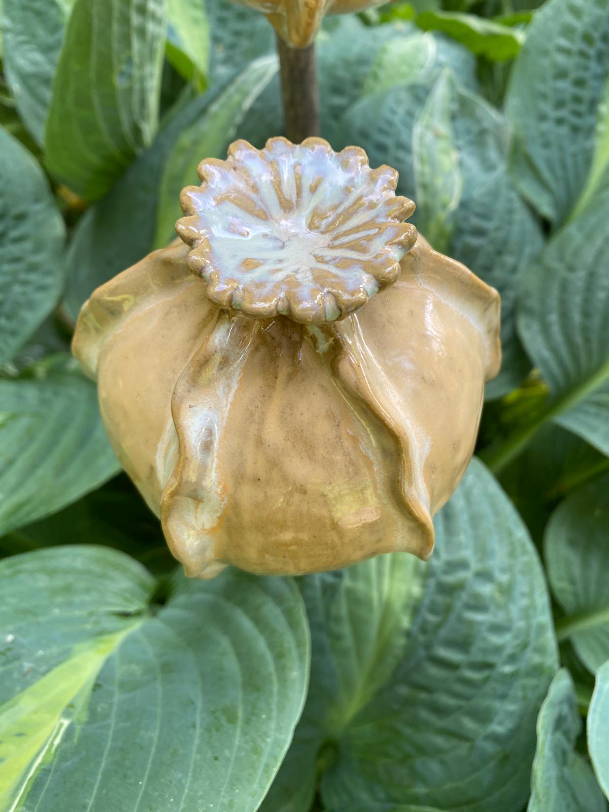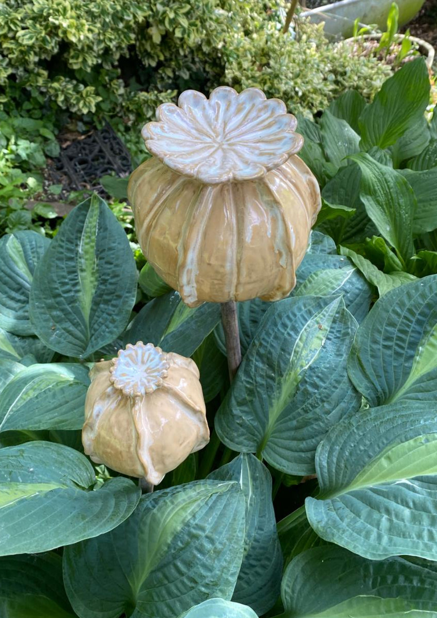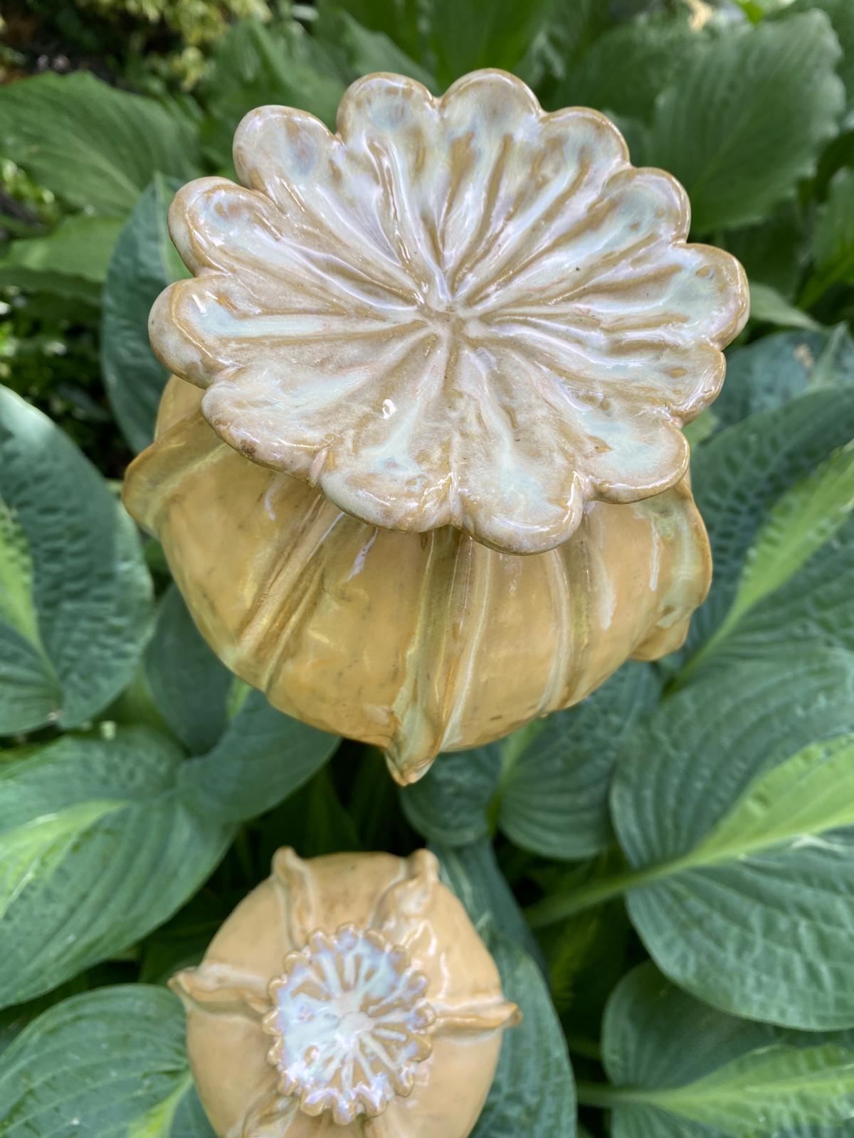 Deze set van twee handgemaakte keramieken papaverbollen in zachtgeel brengt zonnige warmte en speelse elegantie in je tuin of huis. De subtiele tinten geven het geheel een tijdloze, natuurlijke uitstraling.
