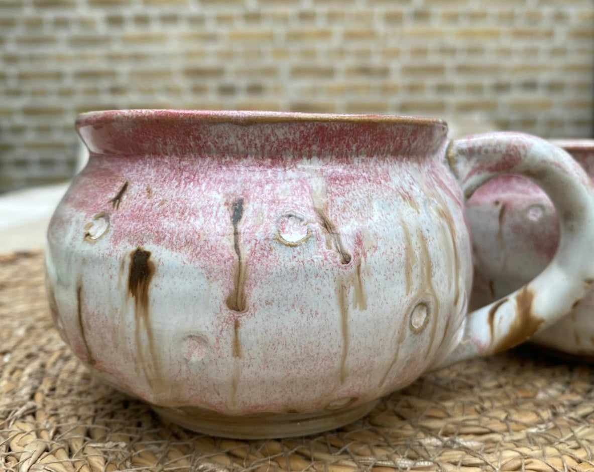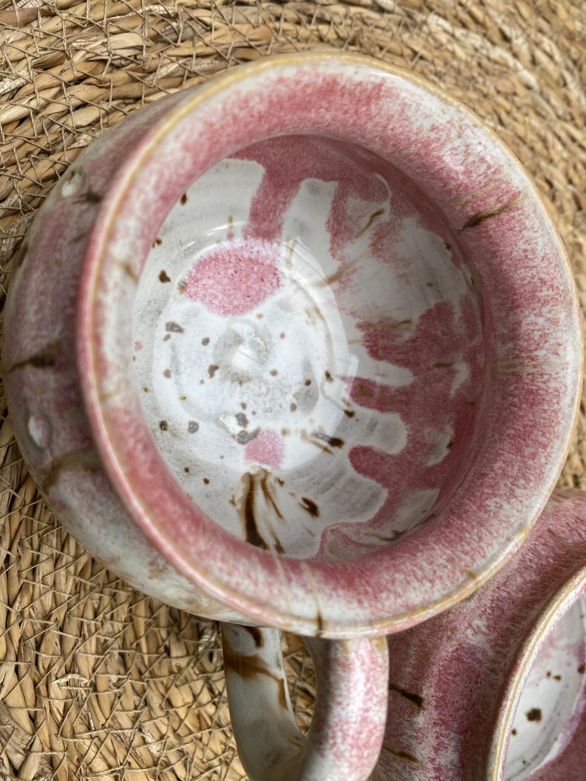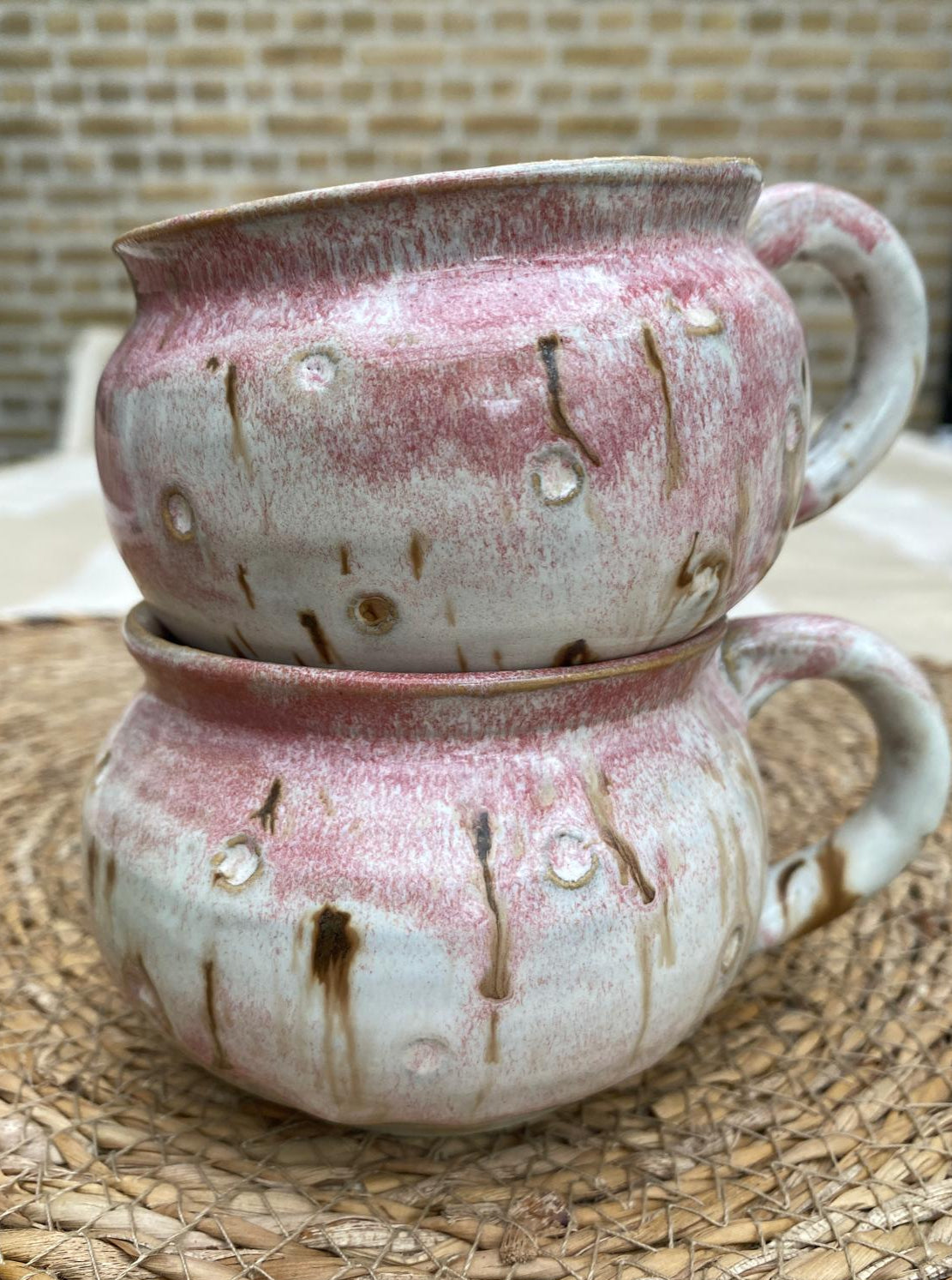 Deze set van twee handgemaakte keramieken mokjes brengt zachtheid en speelsheid samen. Het roze glazuur met crème en bruine stippels geeft elk mokje een warme, eigen uitstraling. Perfect voor koffie, thee, een gezellig moment samen.