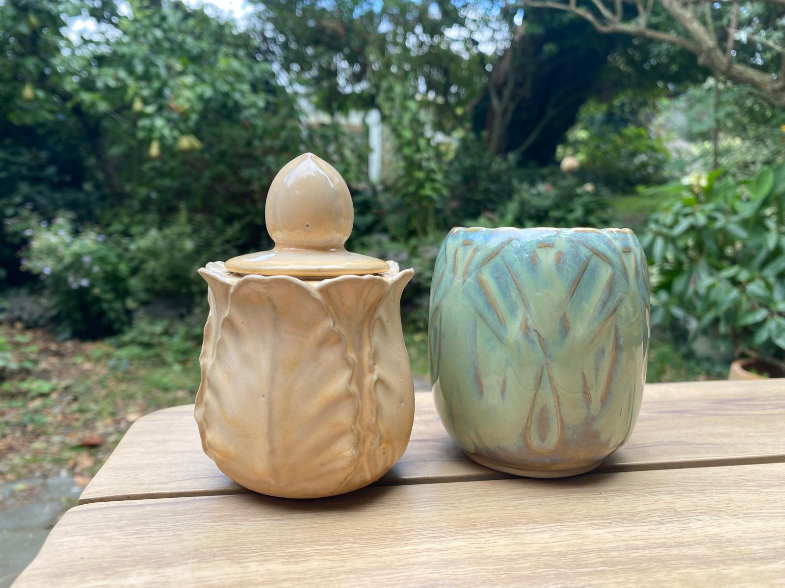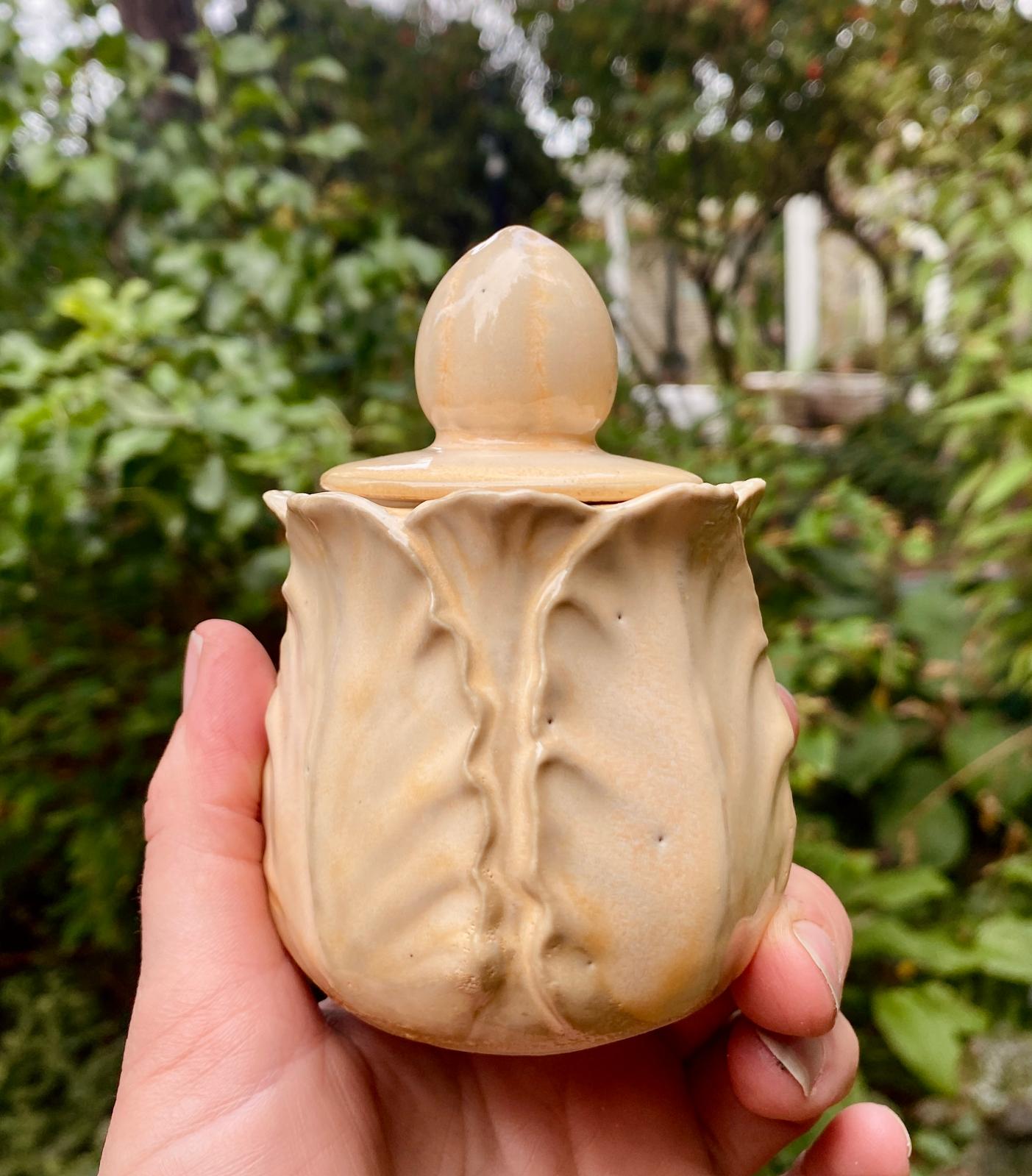 Dit handgemaakte setje bestaat uit twee charmante keramieken potjes: één tulpenbloem met dekseltje in een zachte gele tint en een met tulpenblad in een fris zachtgroen glazuur. Perfect om sieraden, kleine toiletartikelen of andere schatten in te bewaren of gewoon om samen neer te zetten als vrolijk duo.