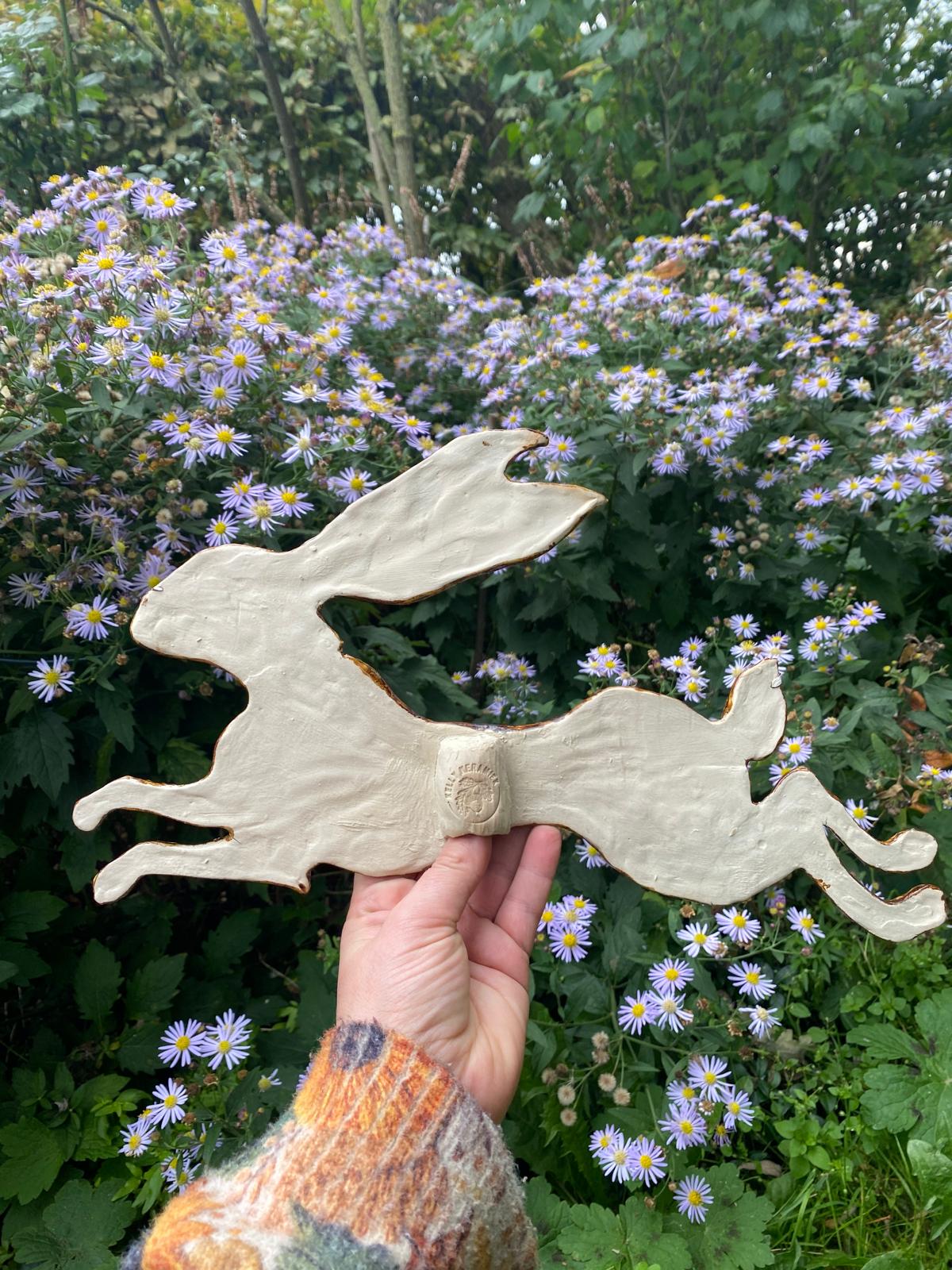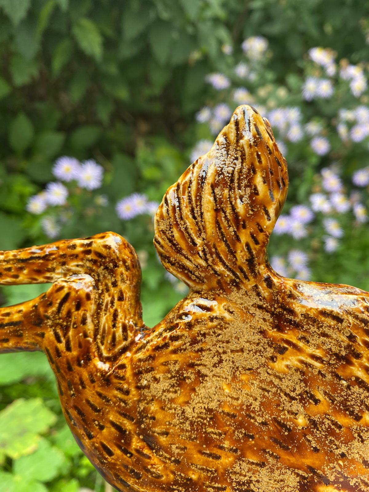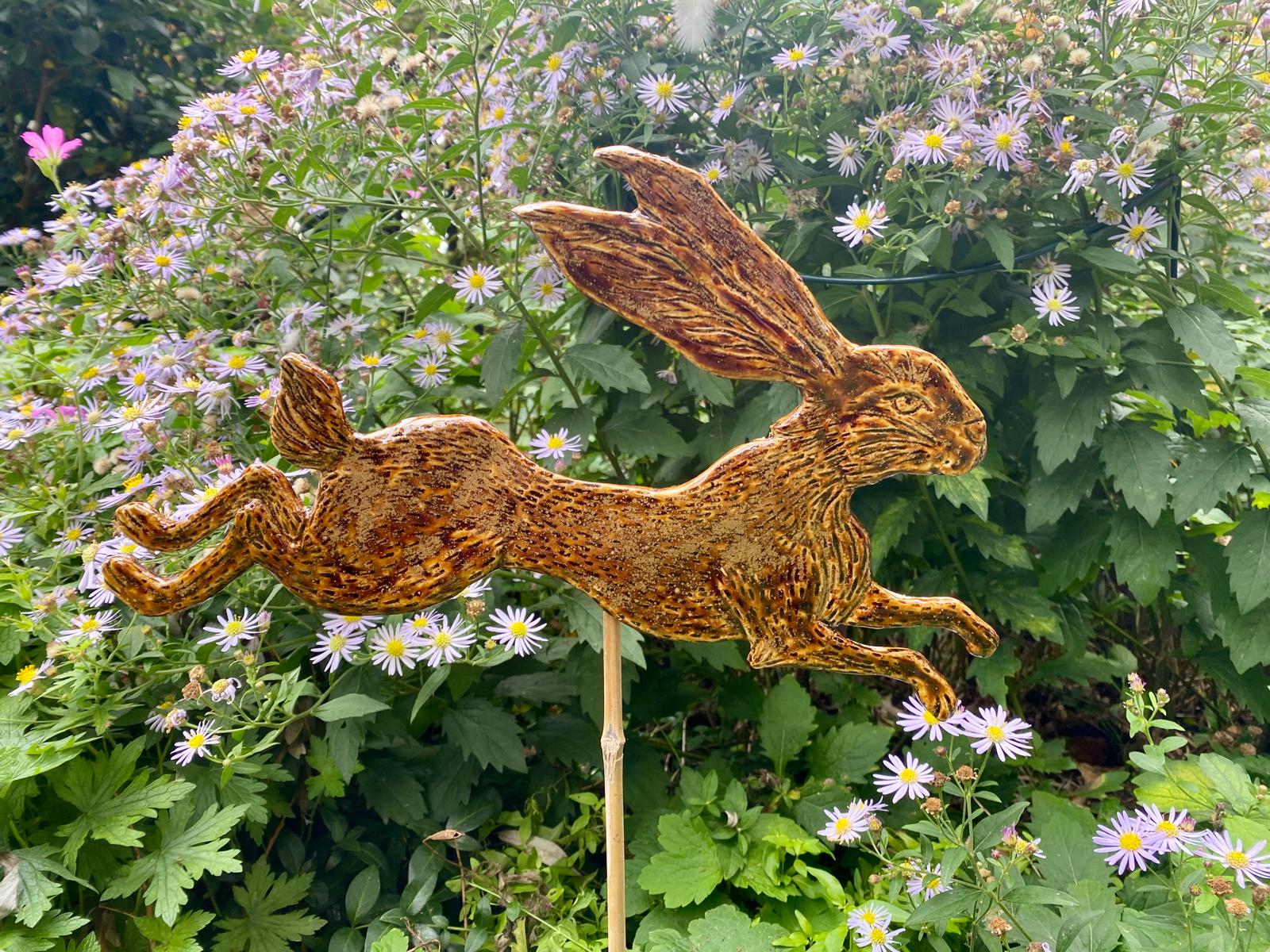 Deze handgemaakte keramieken tuinsteker in de vorm van een konijn brengt een vrolijke en speelse noot in je tuin. Een charmant detail dat tussen bloemen of planten een eigen leven lijkt te krijgen.